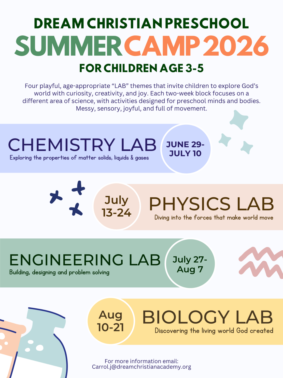 Additionally, we will offer enriching summer camp opportunities for school-aged children, designed to foster learning, faith, and fun. We are excited to serve families through these diverse programs as our preschool develops!